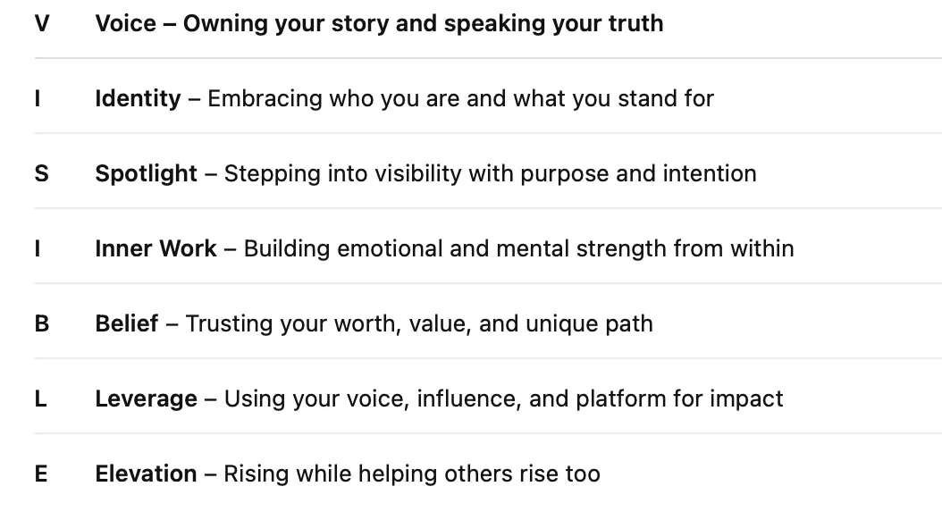 The VISIBLE Framework is the foundation of every keynote, training, and coaching session — blending mindset, strategy, and practical action for sustainable confidence and leadership.
